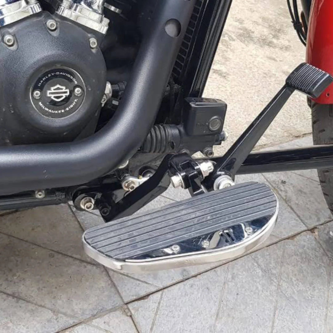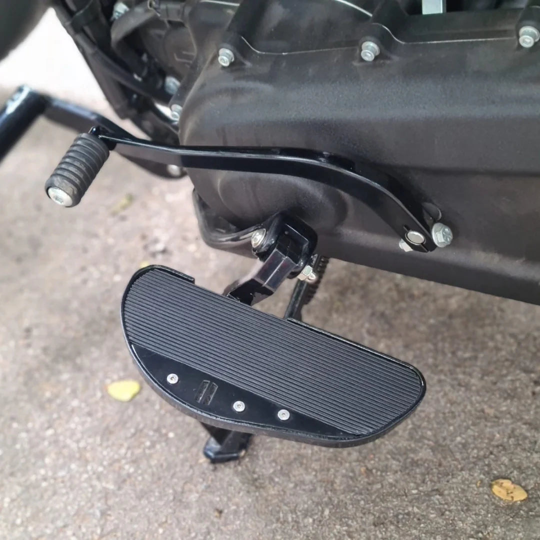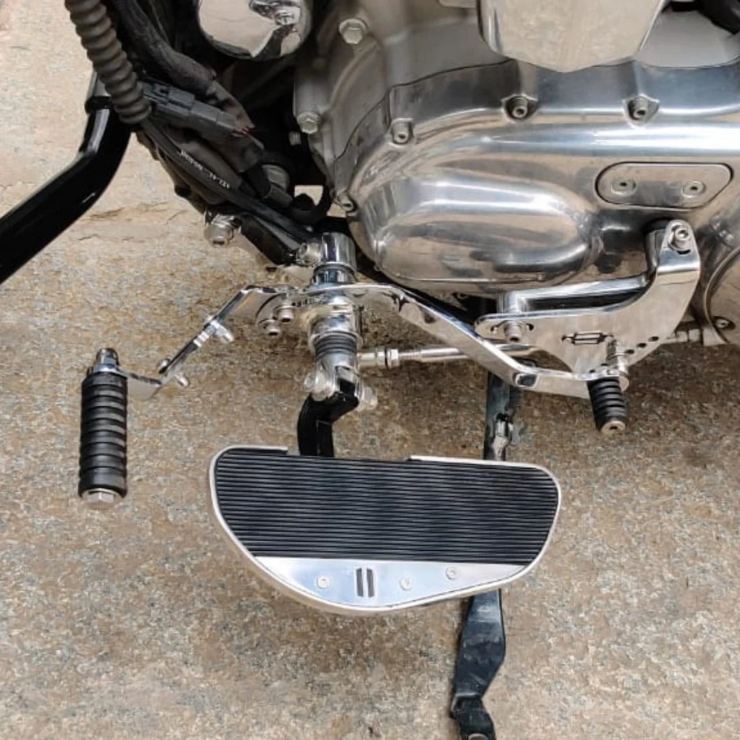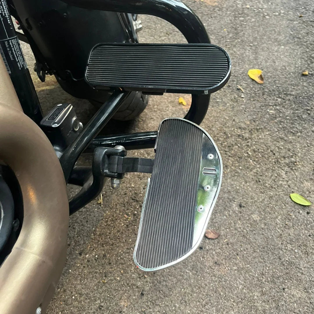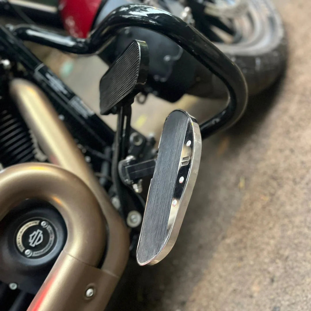 • Especially when a rider’s motorcycle has forward foot controls footboards make more sense than foot pegs. Since in FFC setting, rider’s feet are extended, and the pivot point of the feet changes to the heel as opposed to, between heel and toe in case of mid mounts. Footboards are more comfortable when you pivot your feet at your heel.