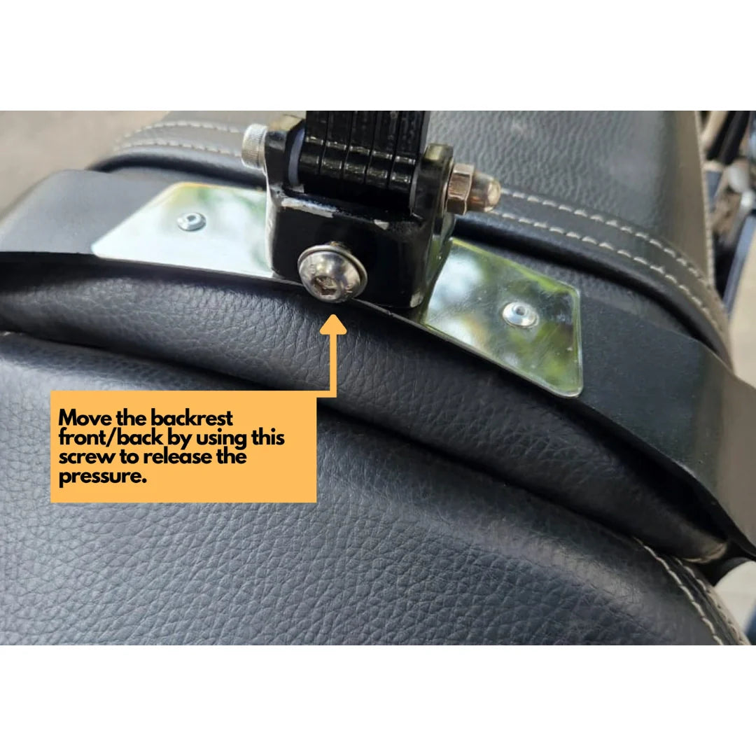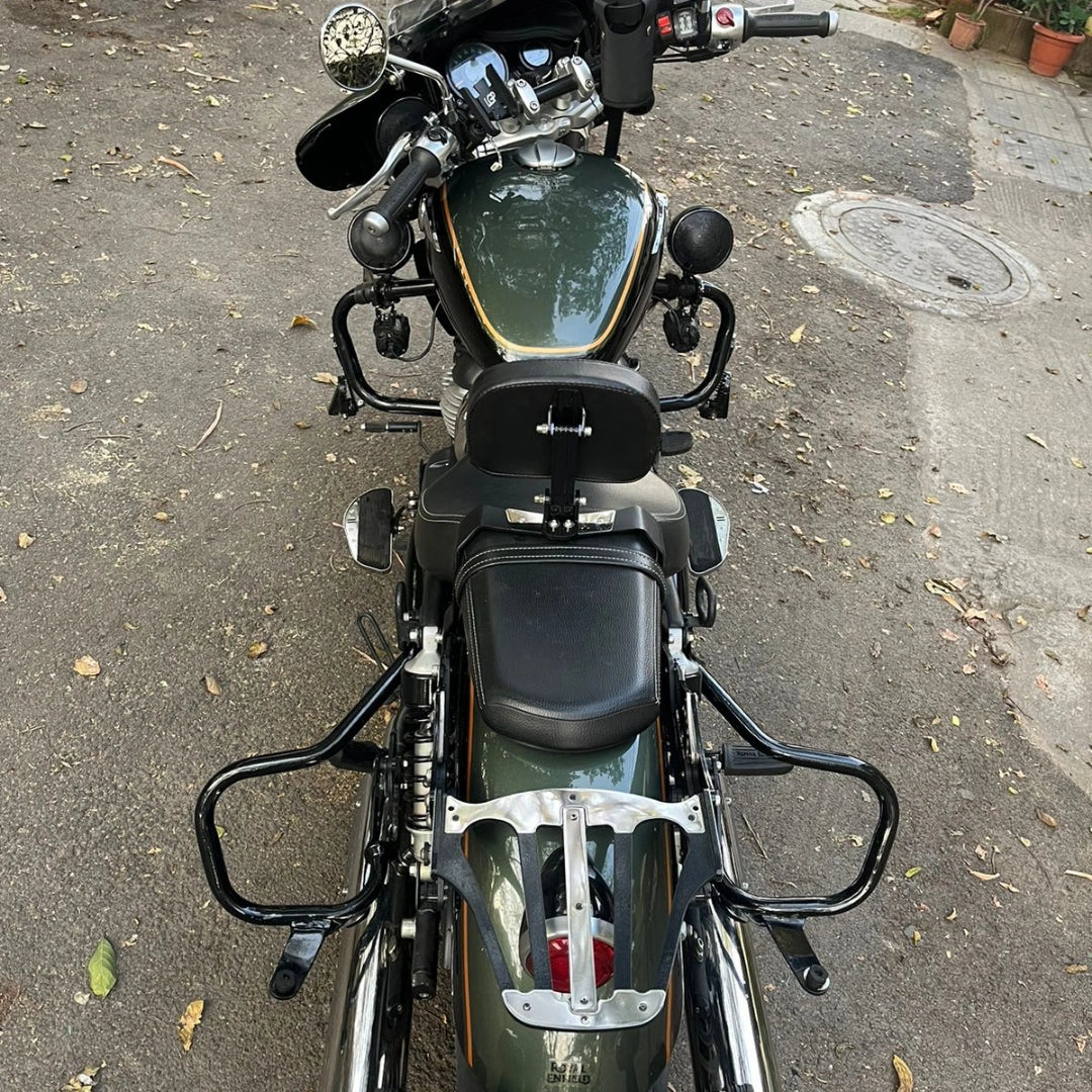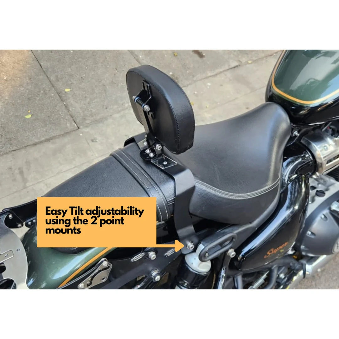 Our backrest kit includes frame mounts, a curved connecting rod, and an adjustable back pad for a hassle-free installation process. Compatible with the stock seat, this backrest seamlessly integrates with your Royal Enfield Super Meteor 650 without the need for seat or frame modifications.