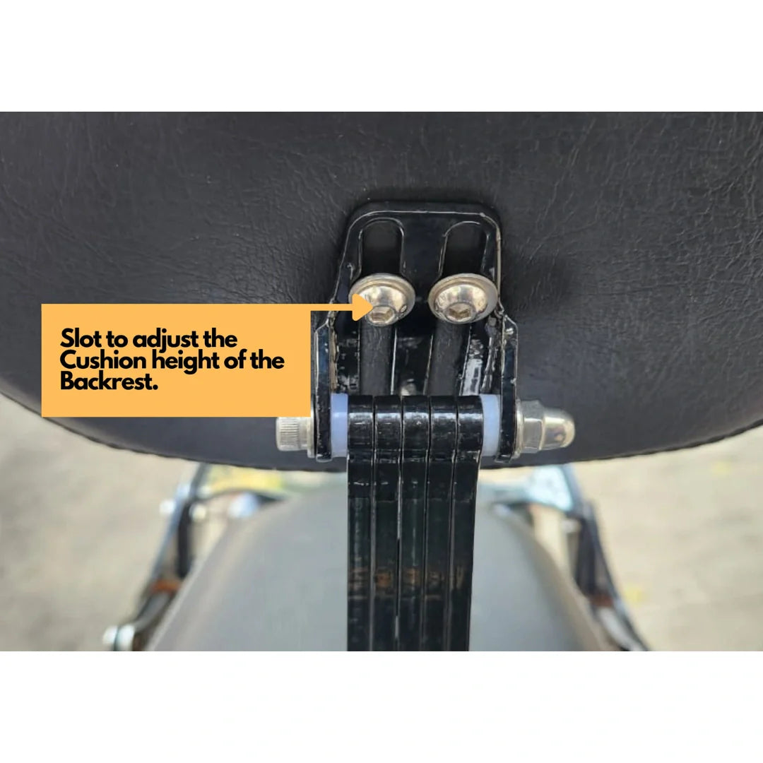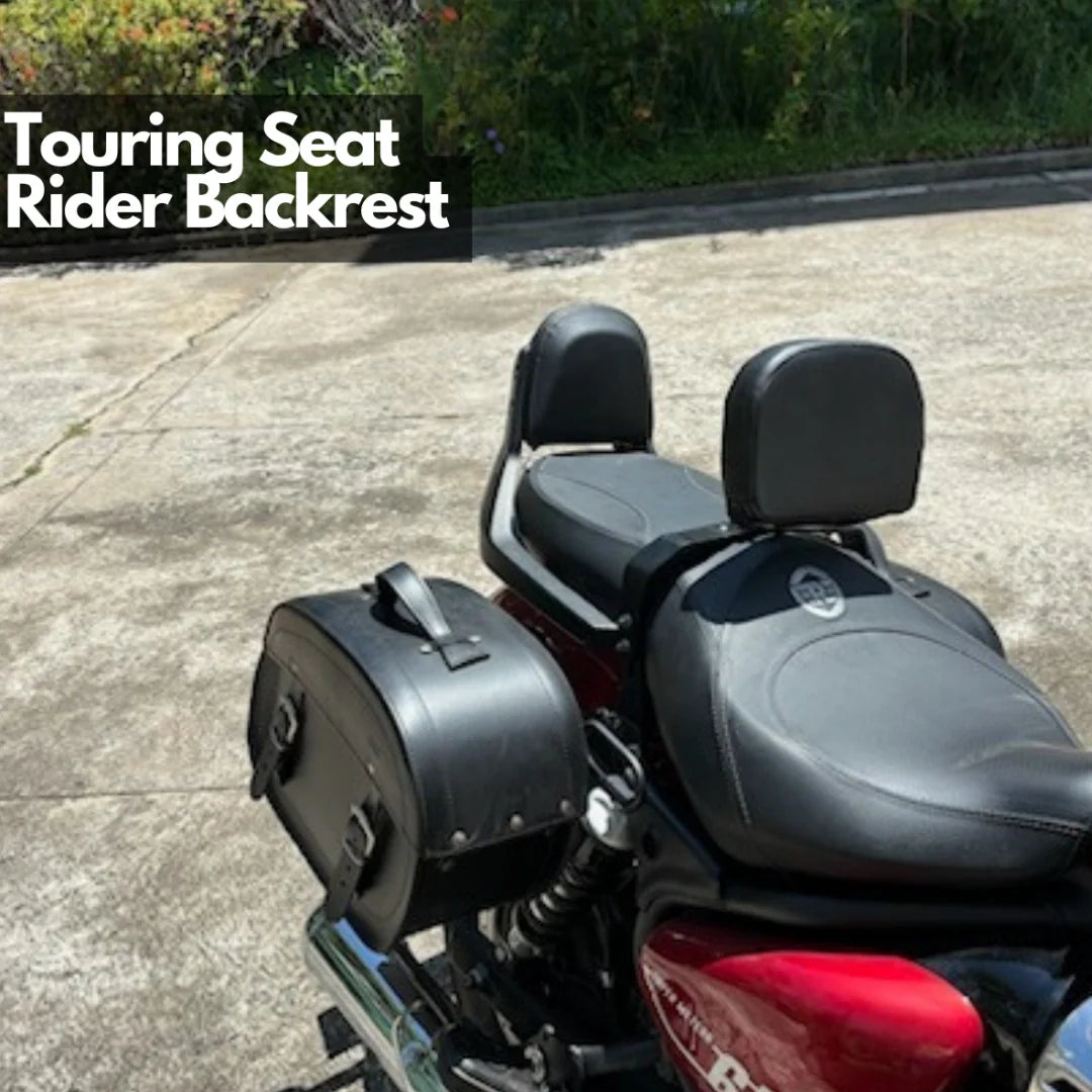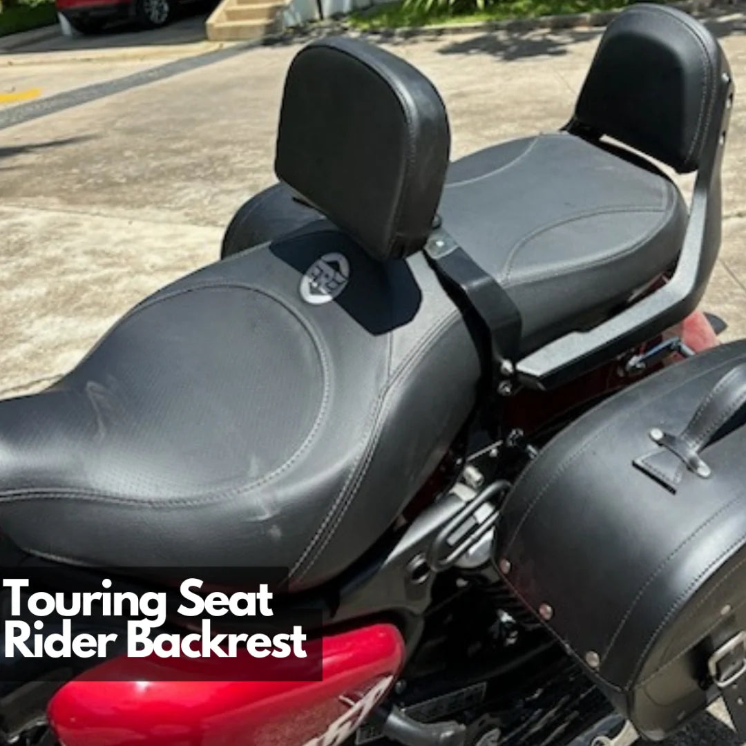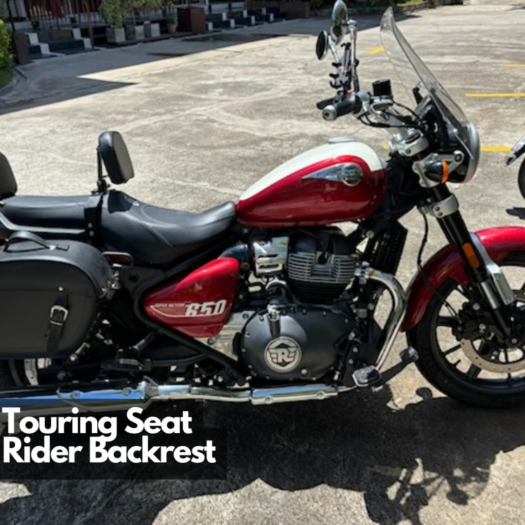 Our backrest kit includes frame mounts, a curved connecting rod, and an adjustable back pad for a hassle-free installation process. Compatible with the stock seat, this backrest seamlessly integrates with your Royal Enfield Super Meteor 650 without the need for seat or frame modifications.